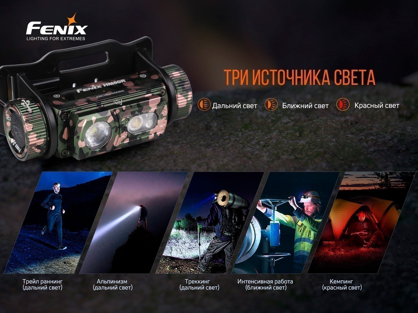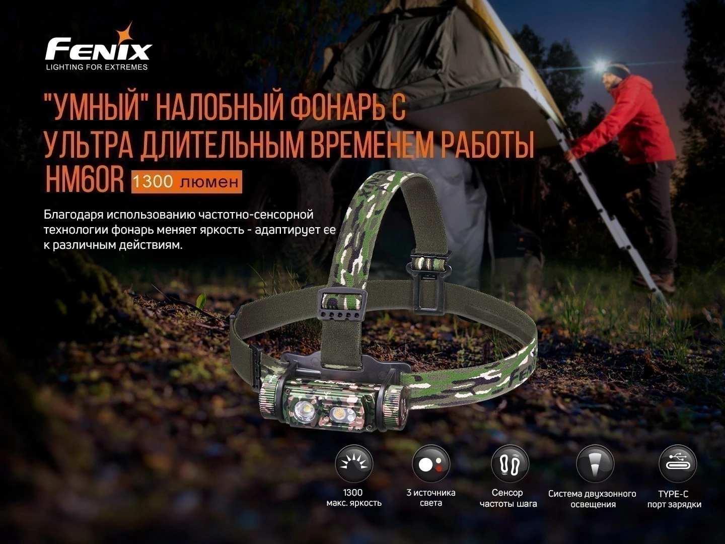 Дальний свет, ближний свет и красный свет комбинируются. Компания Fenix заботится о том, чтобы делать как можно более продвинутые модели, поэтому регулярно улучшает их и выпускает усовершенствованные фонари. Новшеством в этом налобнике является сенсор частоты шага: яркость меняется вместе со скоростью движения. Налобная модель Fenix HM60R создана для максимального комфорта пользователя.