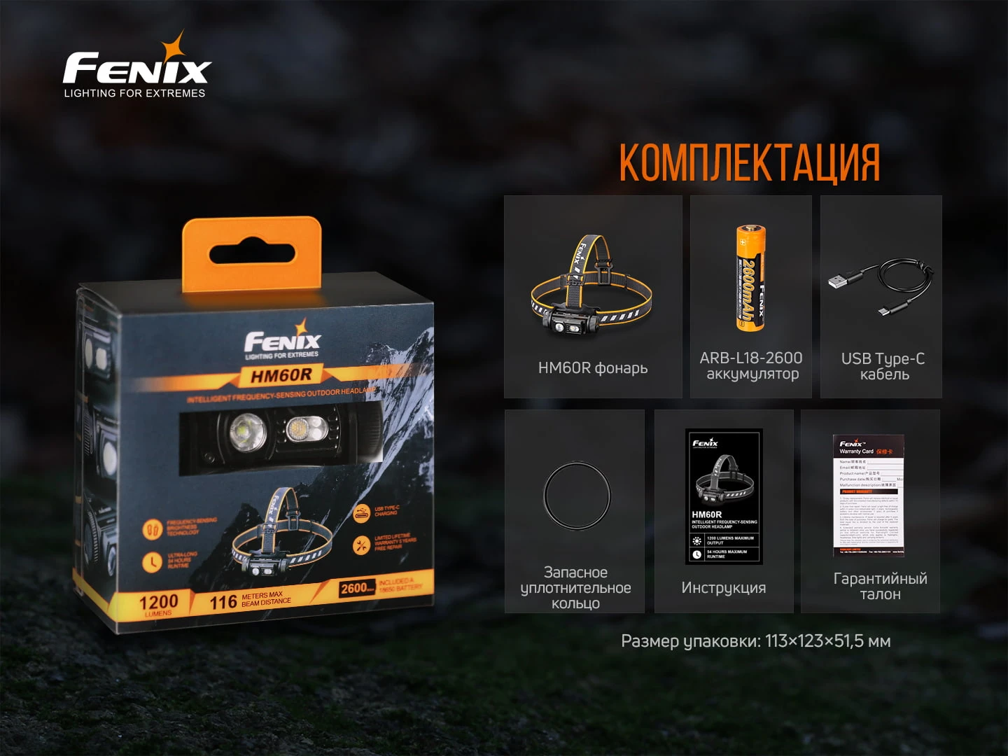Модель фонаря Fenix HM60R, аккумулятор Fenix ARB-L18-3400 Li-ion, кабель для зарядки USB Type-C, запасное уплотнительное кольцо, инструкция, гарантийный талон.