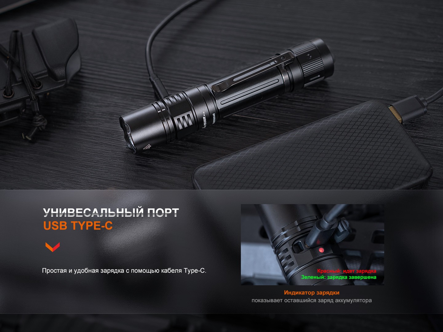 - комплектация – фонарь Fenix PD36R Pro, аккумулятор ARB-L21-5000 V2.0, зарядный кабель USB Type-C, чехол, темляк, запасное уплотнительное кольцо, фонарь Fenix E03R V2.0, кольцо для брелка, руководство пользователя, гарантийный талон;