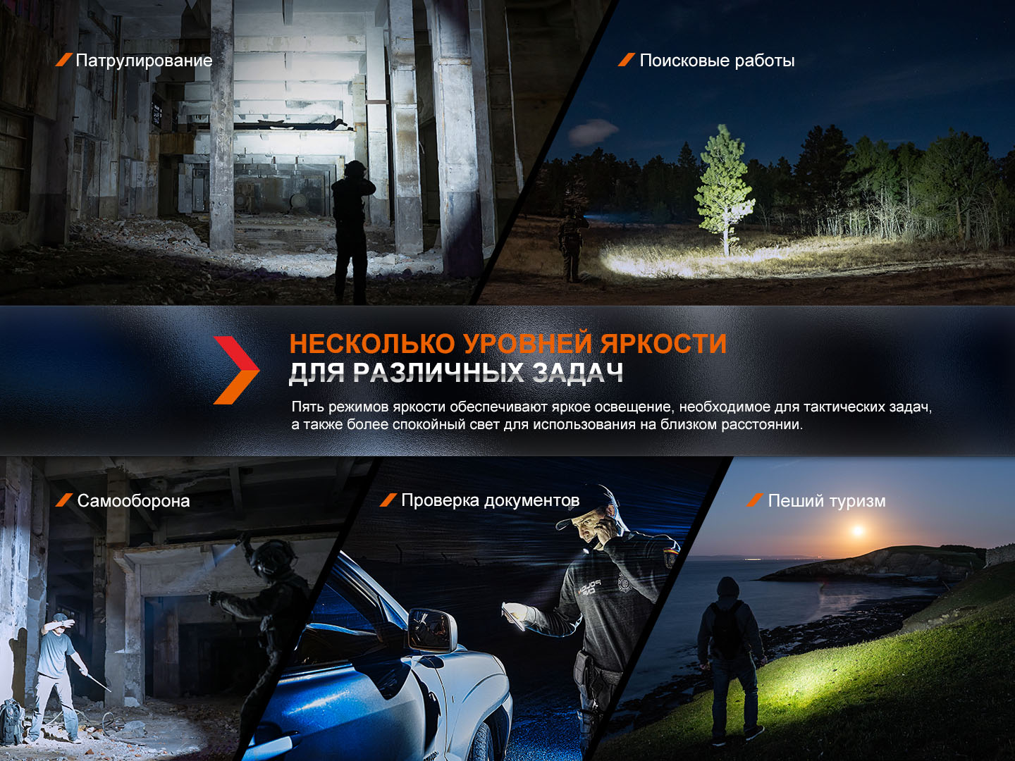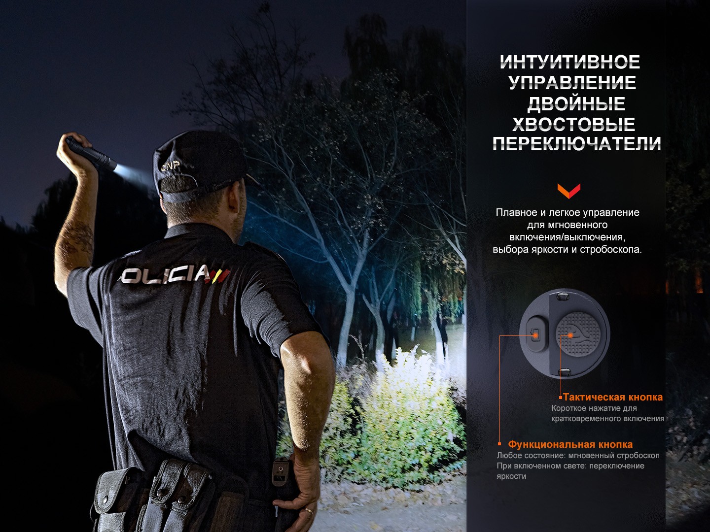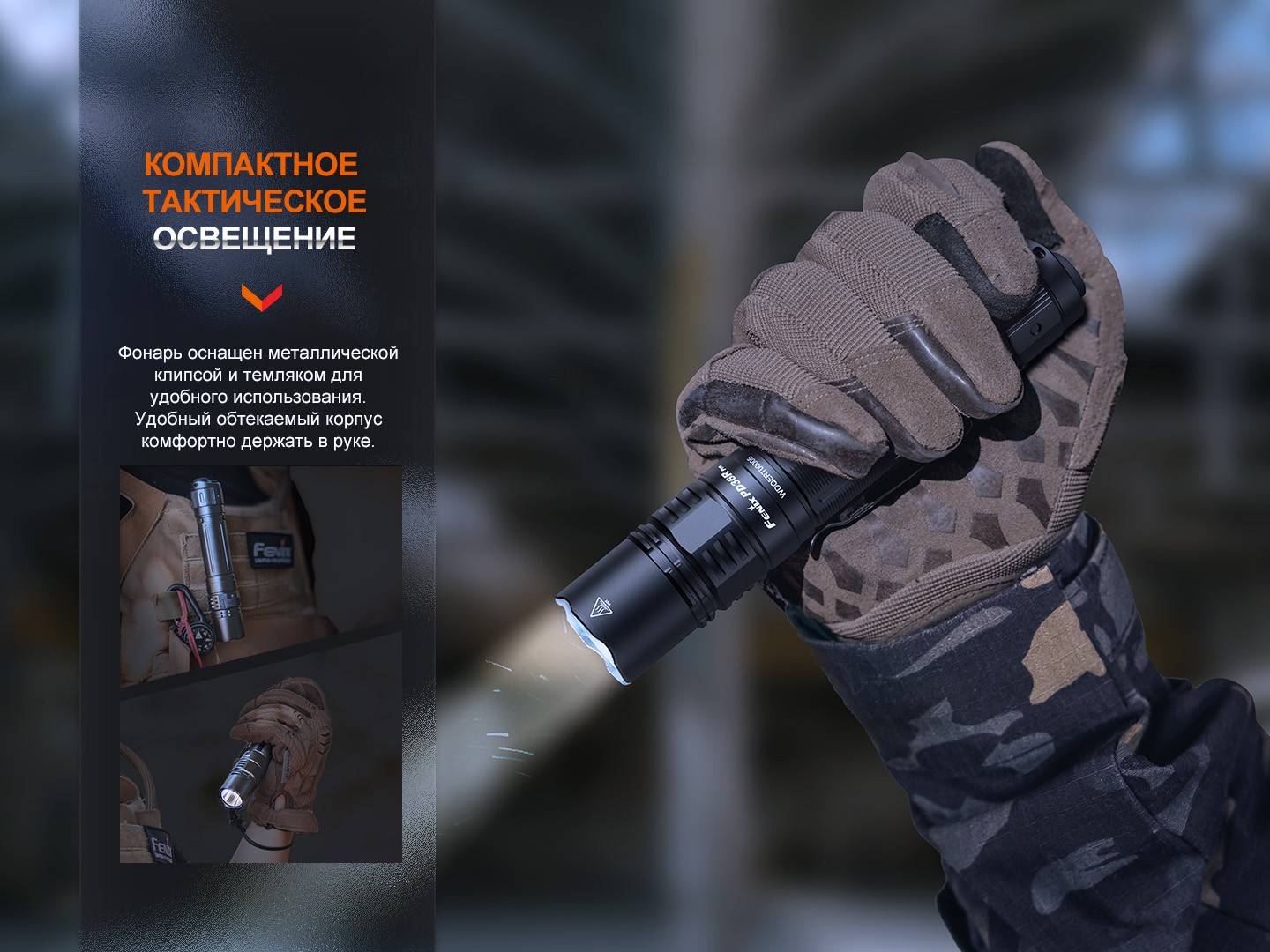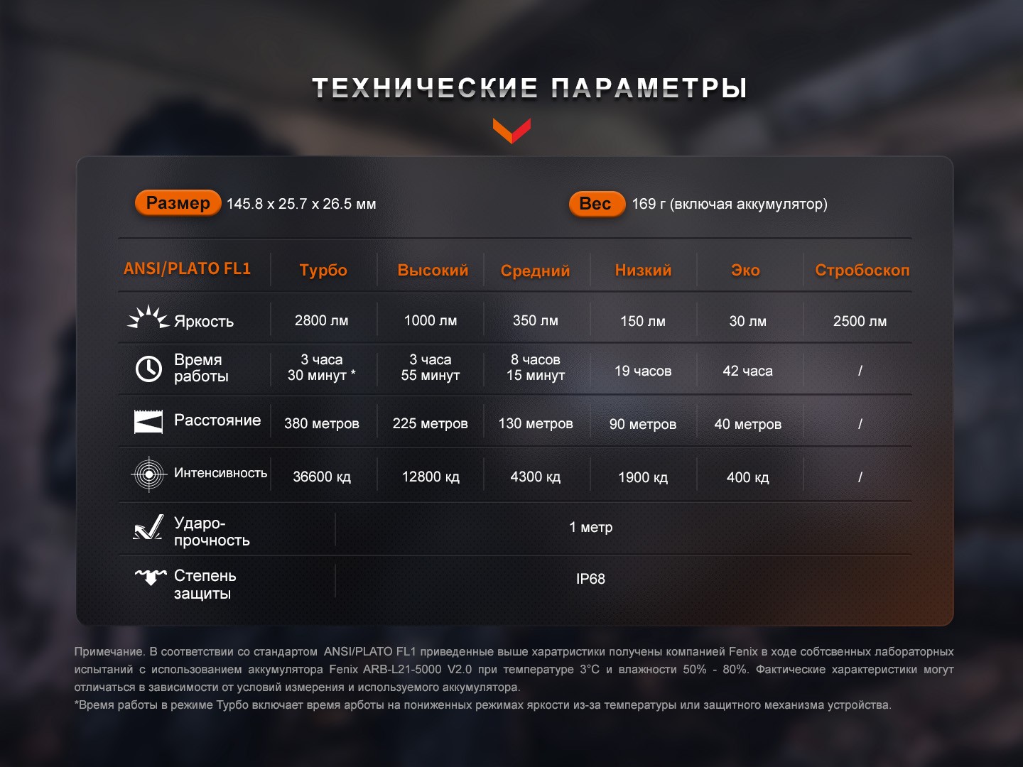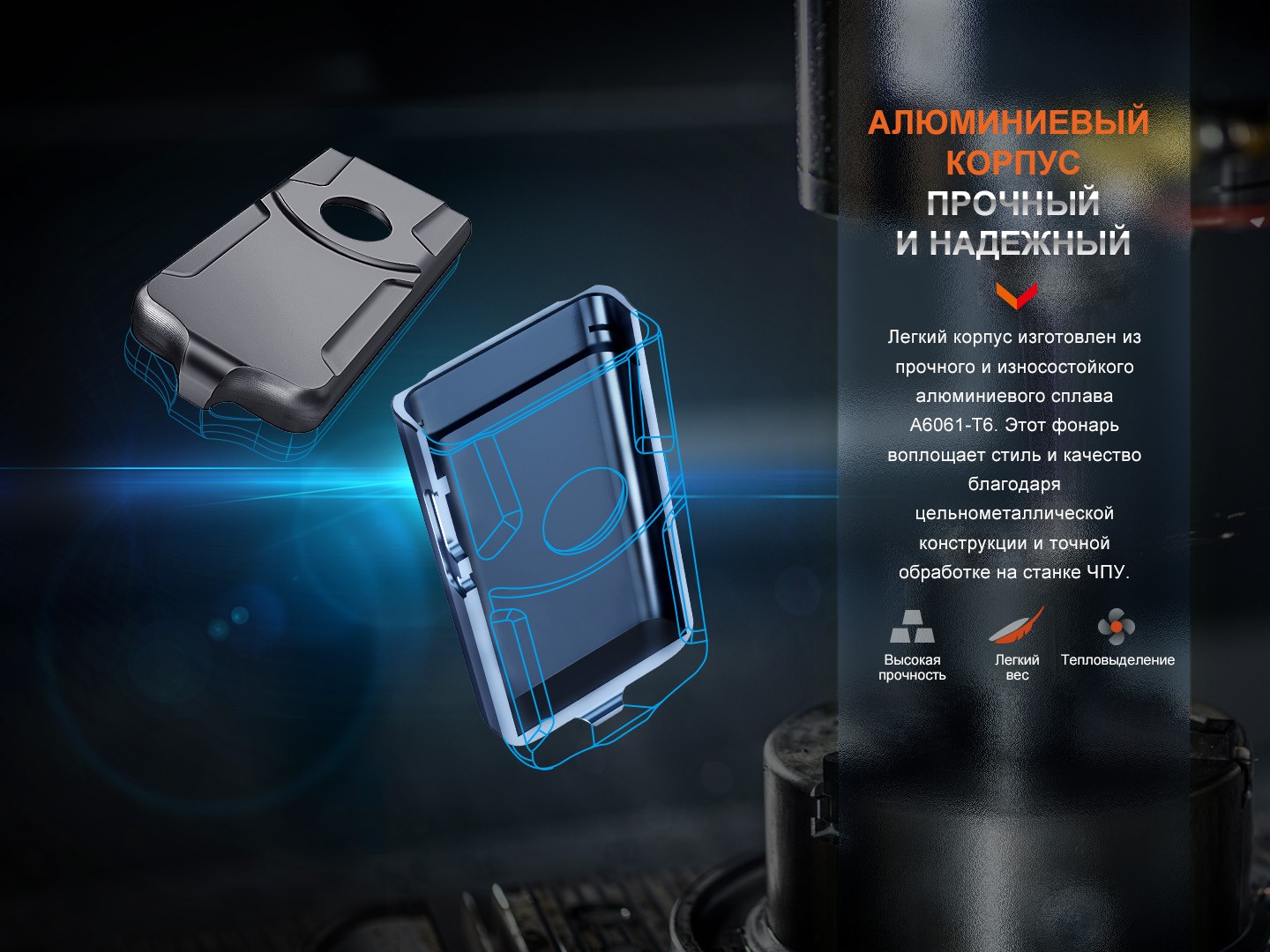 Алюминиевый сплав защищает электронику от повреждений и не утяжеляет прибор. Тактические фонари Fenix отличаются легким весом при обширной функциональной наполненности. Вес этой модели составляет всего 169 грамм. Фонарь защищен по стандарту IP68, что означает полную безопасность от пыли и влаги, даже при падении устройства в воду. Ронять фонарь без вреда к электронике можно с расстояния до 1 метра. Диод надежно спрятан за линзой из закаленного стекла. В фонарь также добавлена функция защиты от перегрева.