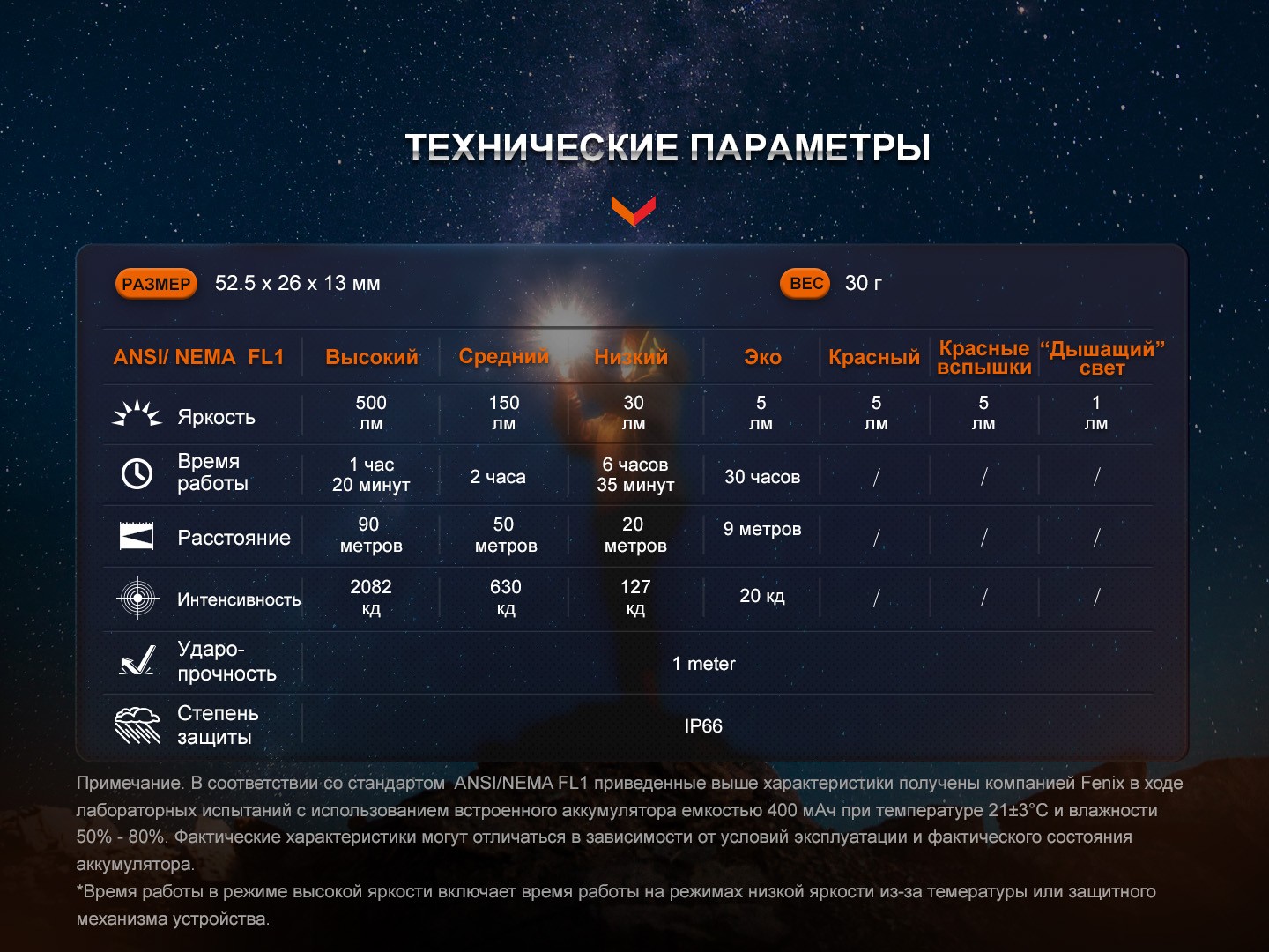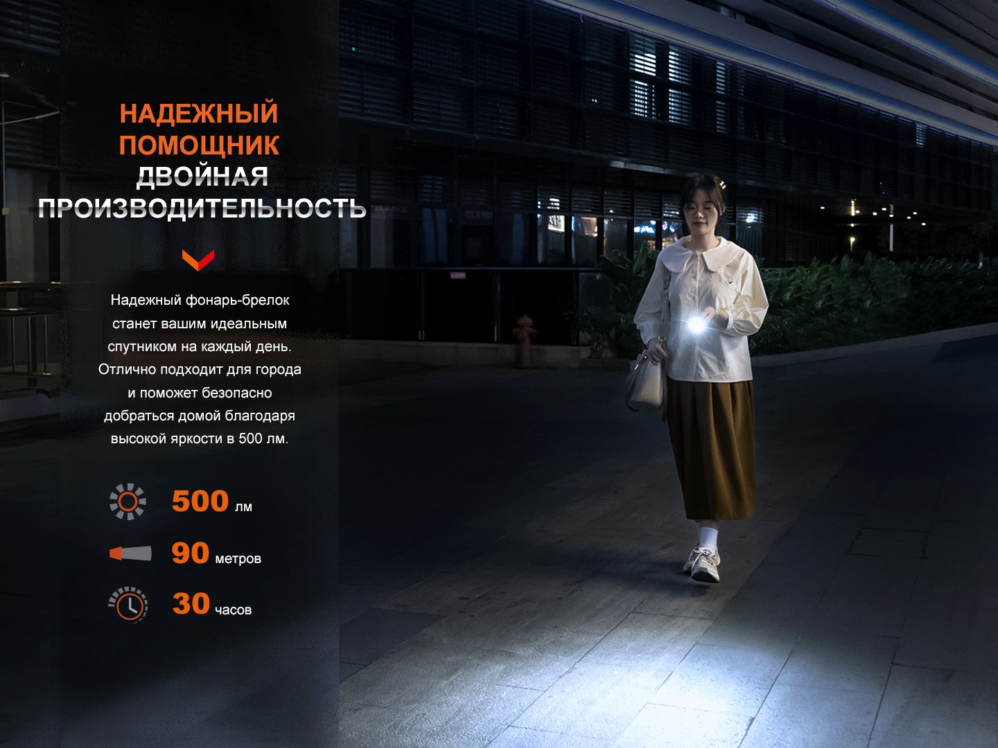 Маленький EDC-фонарь Fenix E03R V2.0 весит всего 30 грамм, но заключает в себе мощность освещения в 500 люмен. Фонарь имеет 7 режимов, среди которых 5 белых и 2 режима красного света. Дальнобойность луча на самом мощном режиме достигает 90 метров, а на самой низкой мощности фонарь проработает до 30 часов. Вам не придется постоянно менять батарейки в устройстве, так как фонарь имеет встроенный аккумулятор с емкостью до 400 мАч.