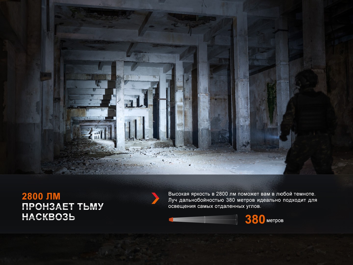 - предельная яркость тактического фонаря достигает 2800 люмен;