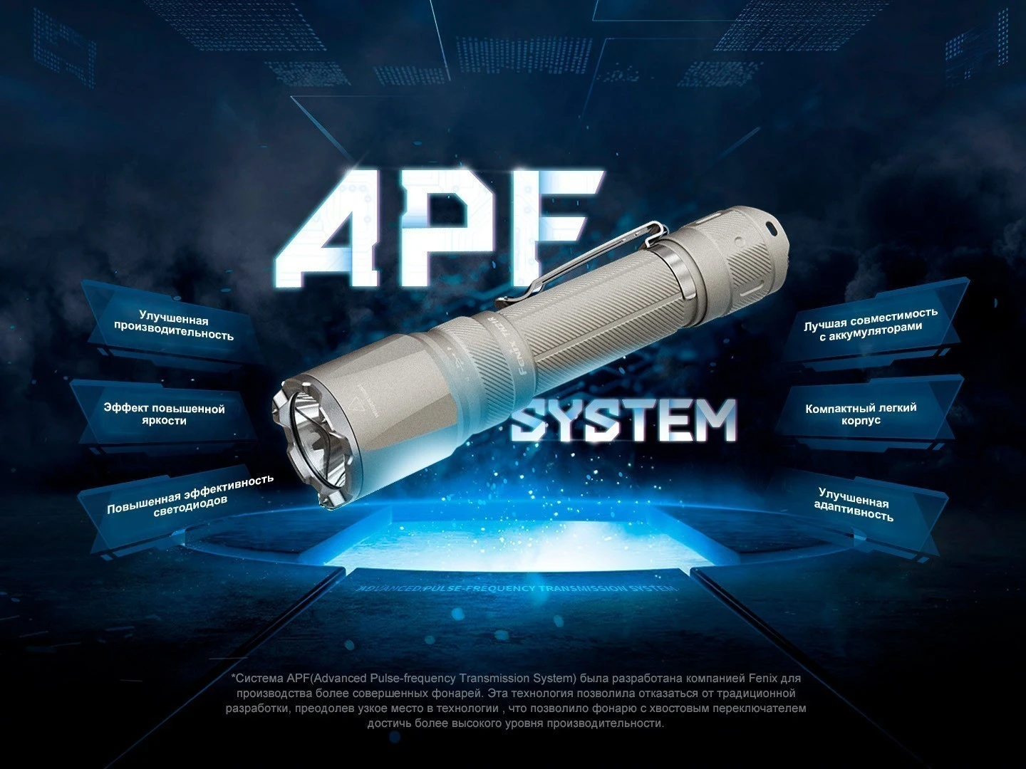 Управление осуществляется с помощью тактической и функциональной кнопок в торце корпуса. Тактическая круглая кнопка предназначена для включений кратковременного или постоянного освещения и для активации режима Burst. Функциональная — для переключения режимов и активации мгновенного стробоскопа. Технология APF (Advanced Pulse-Frequency — усовершенствованная система частотно-импульсной передачи) обеспечивает стабильную работу электроники и эффективность работы тактического фонаря в любой ситуации. Интеллектуальная система контроля температуры снижает яркость при перегреве, предотвращая повреждение фонаря от высокой температуры.
