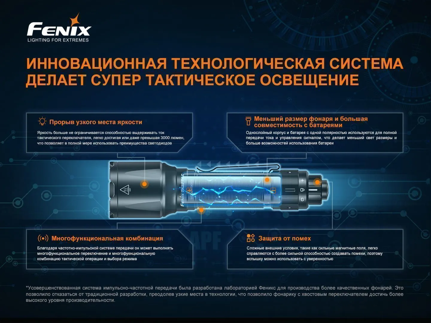 Комплектация: фонарь Fenix TK22TAC, аккумулятор Fenix ARB-L21-5000U литий-ионный, кабель для зарядки USB Type-C, чехол, запасное уплотнительное кольцо, инструкция пользователя, гарантийный талон.