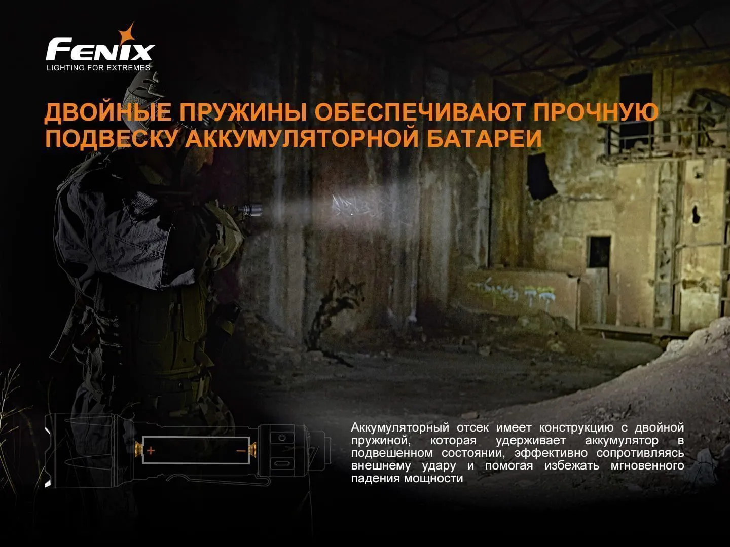 Учитывайте, что такие показатели работы фонаря удалось получить в процессе проведения лабораторных испытаний. Для этого применялся аккумулятор Fenix ARB-L21-5000U при температуре 21 +-3 градуса Цельсия и влажности 50-80 процентов. Фактические параметры работы фонаря могут отличаться от указанных, в зависимости от элементов питания и условий внешней среды.