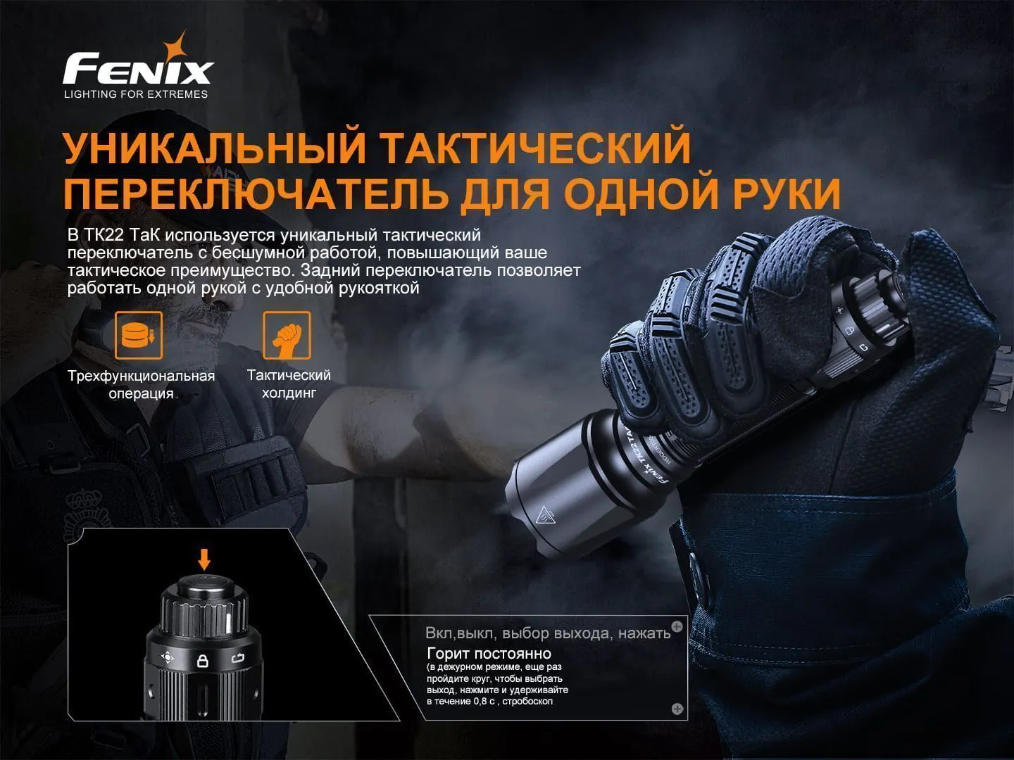 Фонарь Fenix TK22TAC необходим для военного использования. Он был создан с учётом потребностей тактического и дежурного освещения, соответственно, имеет тактические и дежурные режимы.