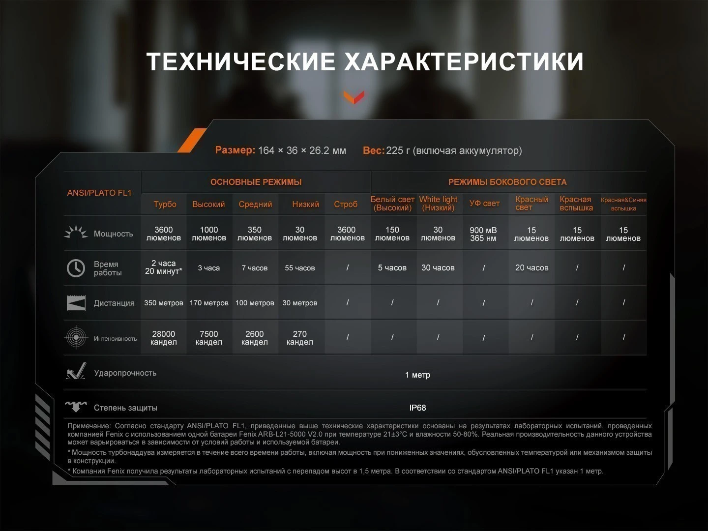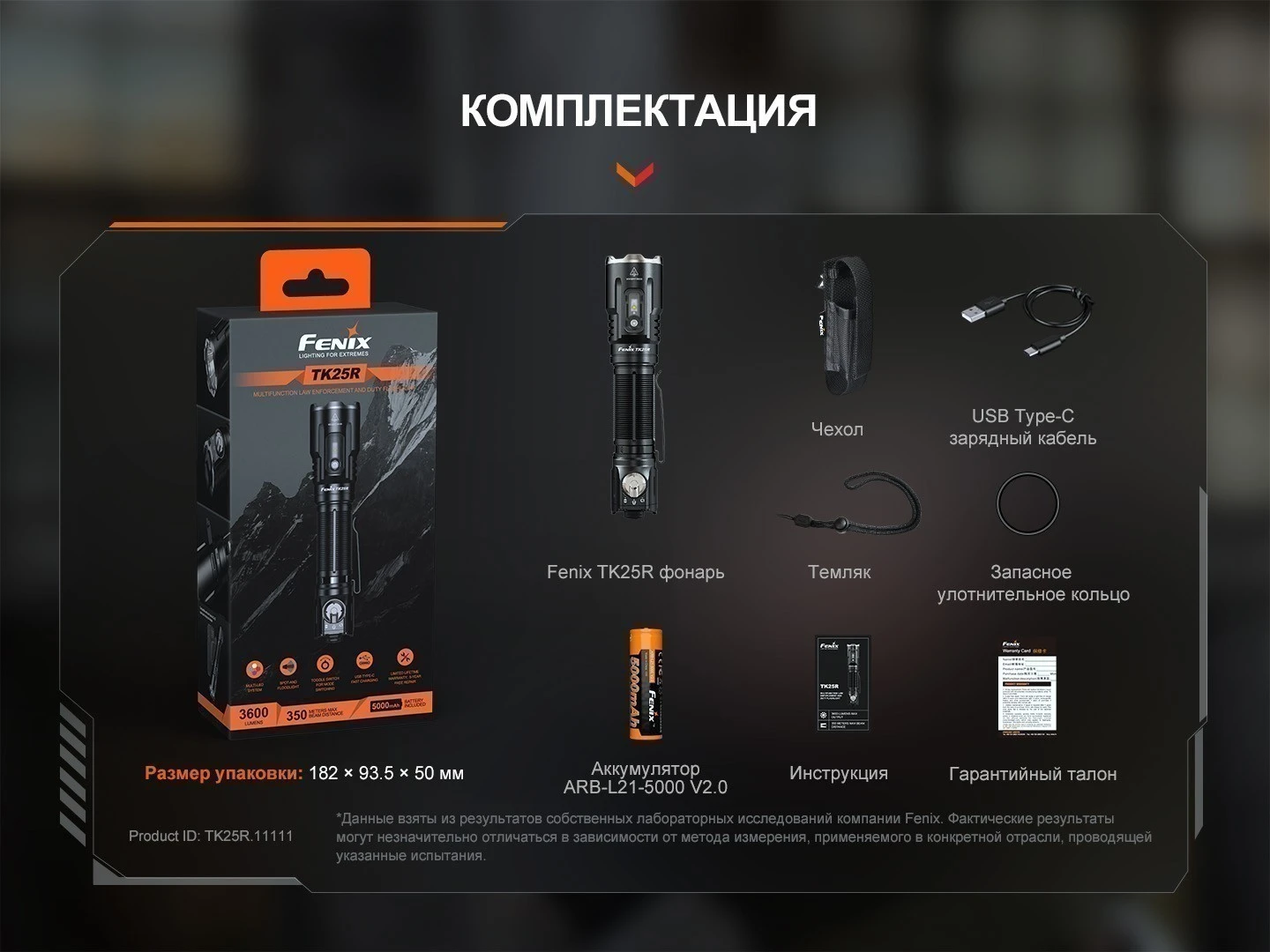 | Комплектация | Фонарь Fenix TK25R, аккумулятор Fenix ARB-L21-5000 V2.0, темляк, кабель Type-A to Type-C, чехол, запасное уплотнительное кольцо, руководство пользователя, гарантийный талон | ||||||||||