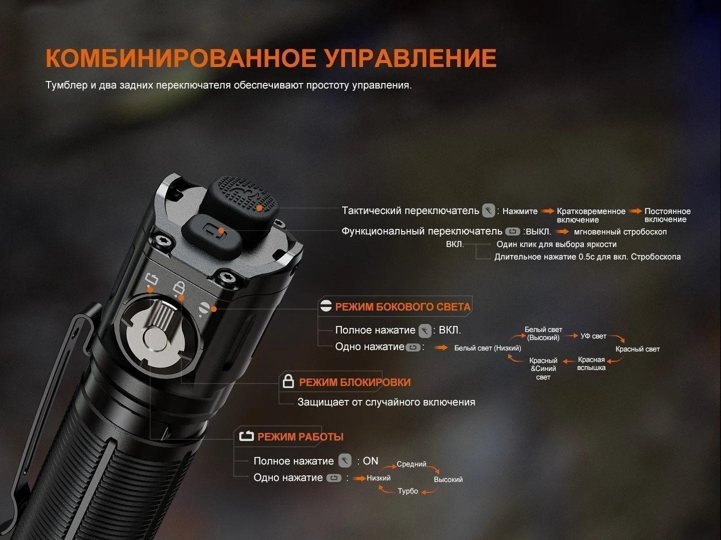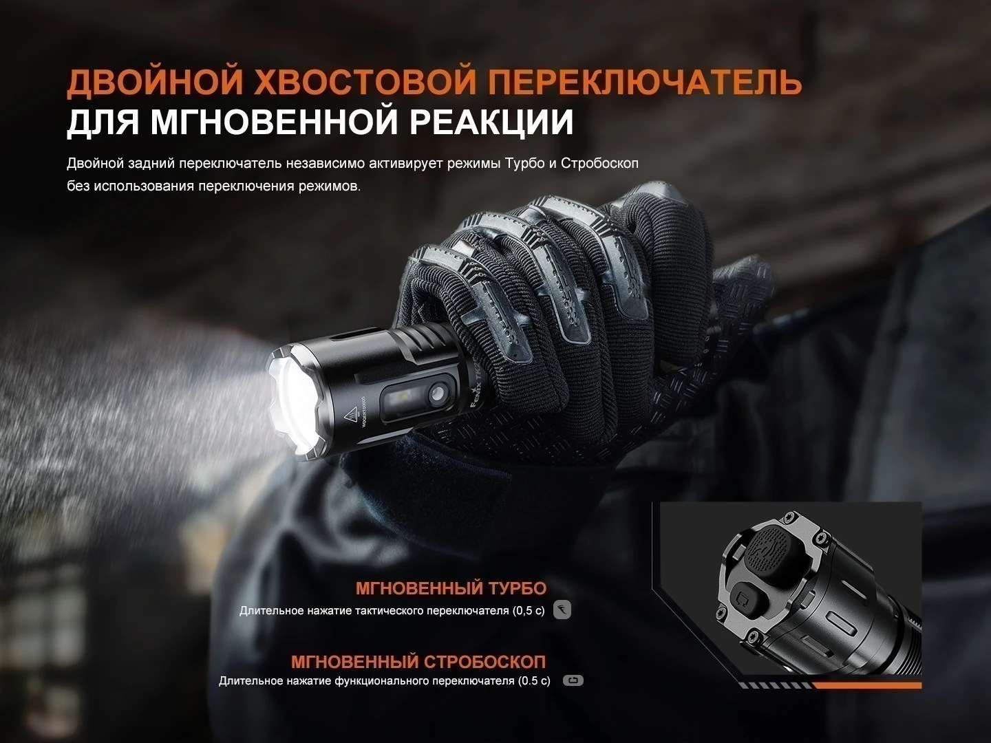 Управление продумано для оперативного применения. С помощью поворотного переключателя и двойной кнопкой в хвостовой части корпуса, TK25R позволяет выбирать между основными и функциональными режимами, а также быстро активировать стробоскоп. Фонарь удобно использовать в стрессовых ситуациях, он обеспечивает мгновенную реакцию и максимальную мощность по первому нажатию.