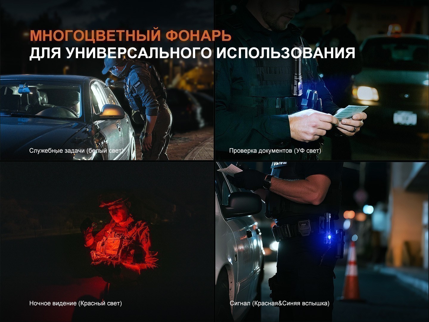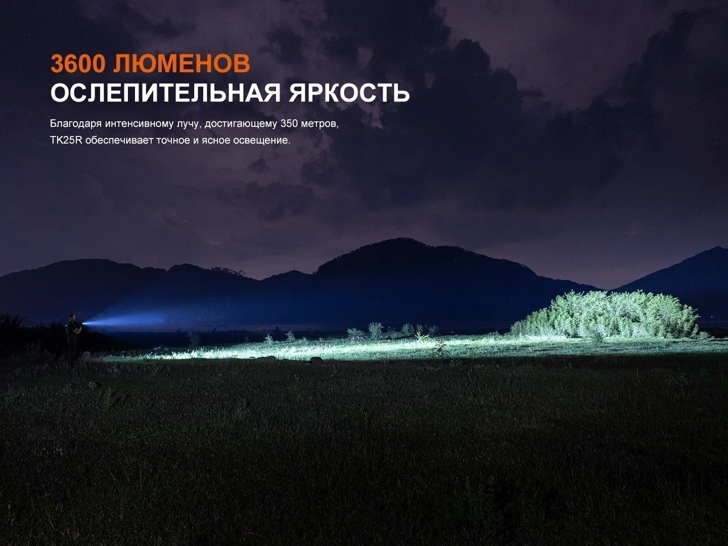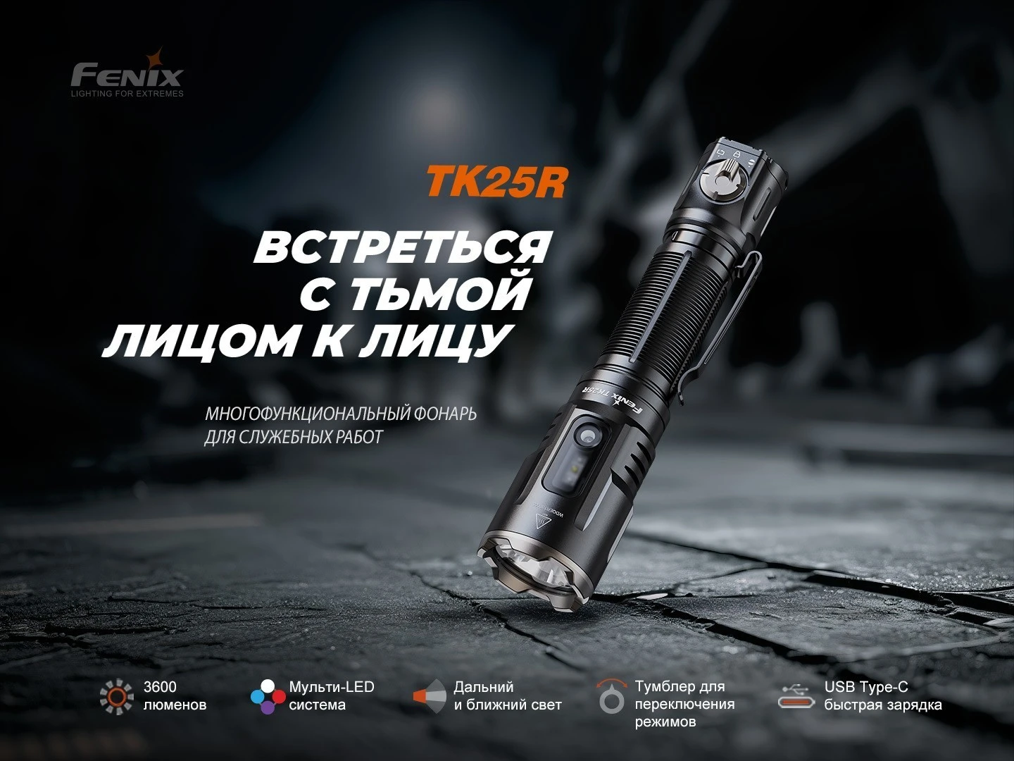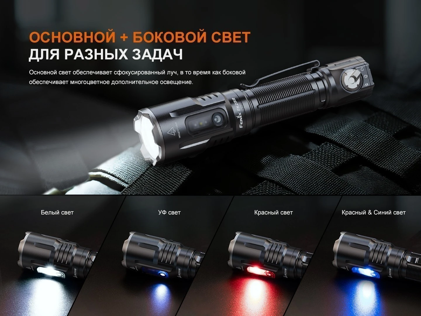Главная особенность модели — впечатляющая яркость до 3600 люмен. TK25R способен эффективно освещать большие пространства и удалённые объекты, а дальность луча 350 метров обеспечивает уверенный контроль территории. Современный светодиод с ресурсом 50 000 часов делает TK25R действительно долговечным инструментом. Фонарь Fenix оснащён дальним и ближним светом, а также дополнительными источниками: боковыми светодиодами, УФ-светом для специальных задач, красным и синим светом, включая режим полицейского маяка. Такая мультифункциональность фонаря позволяет адаптироваться к различным сценариям — от тактических операций до поисковых мероприятий.