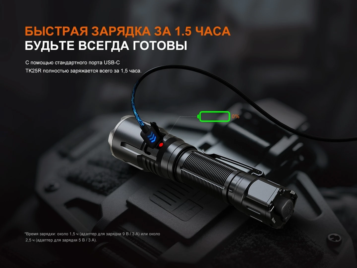 Аккумулятор 5000 мАч, обеспечивает длительную автономность — до 55 часов работы в экономичных режимах. С помощью стандартной USB-C зарядки фонарь полностью заряжается за 1,5 часа, что особенно важно для интенсивной эксплуатации. Фонарь Fenix TK25R демонстрирует стабильную яркость благодаря интеллектуальной системе регулировки питания, что делает его практичным решением для ежедневной службы.