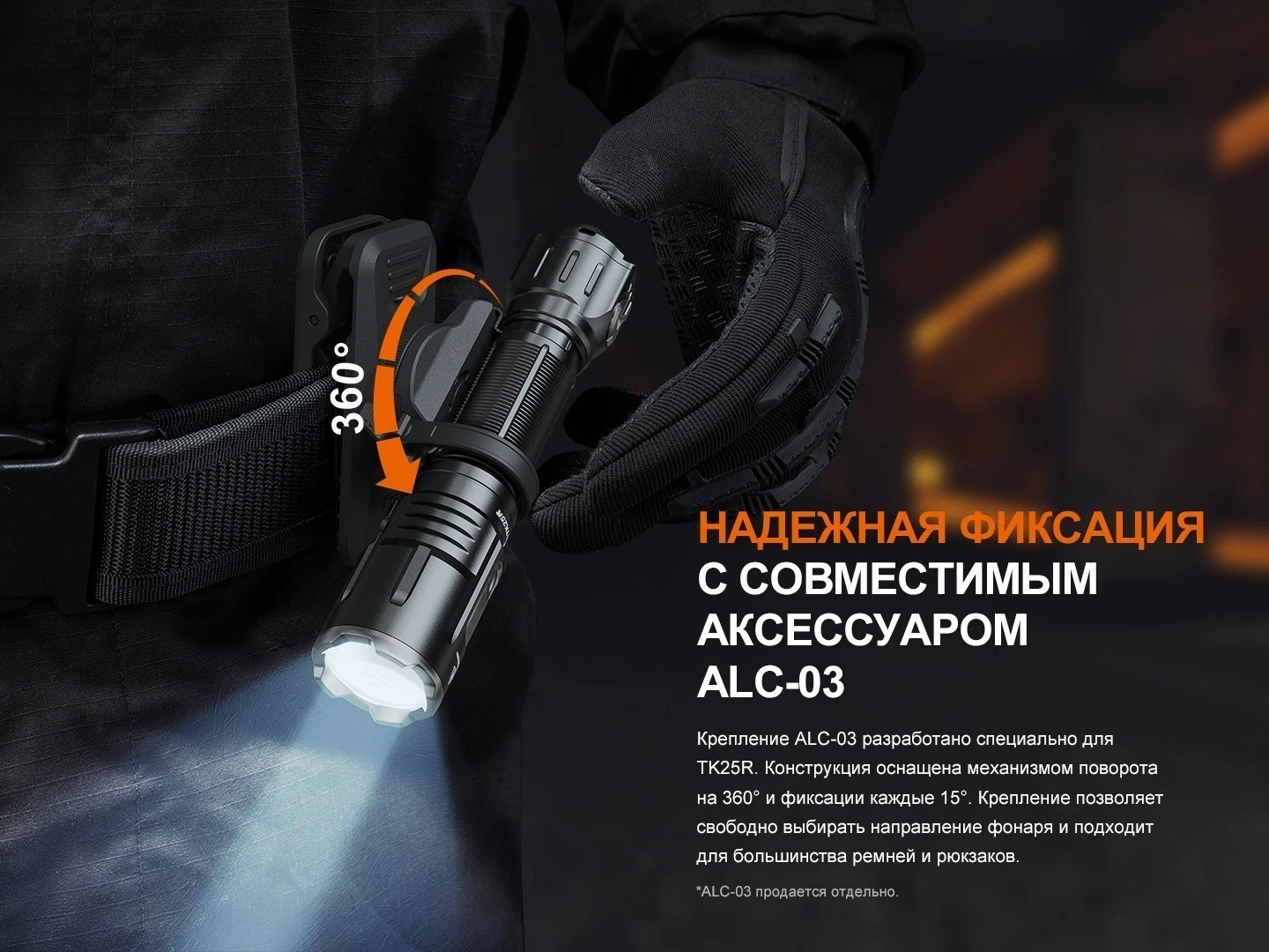 Для фонаря Fenix TK25R доступны фирменные аксессуары от Fenix, которые расширяют его функциональность. Поворотное крепление ALC-03 обеспечивает удобное освещение со свободными руками, а чехол ALP-20 — безопасное ношение на поясе. Дополнительные крепления серии ALG дают возможность установки на оружие, делая фонарь ещё более универсальным для профессиональных задач.