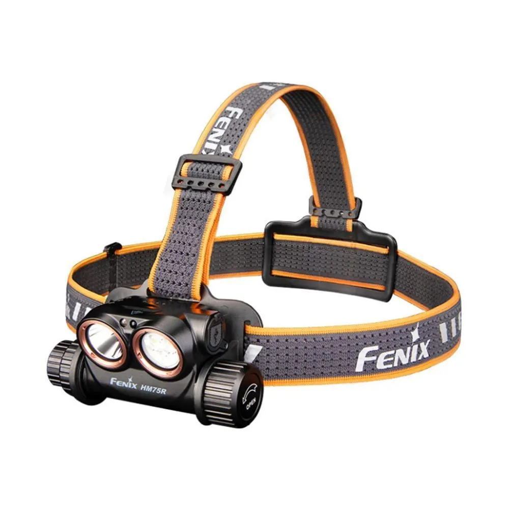 Модель оснащена тремя светодиодами: 2 холодных белых — LUMINUS SST40 и LUMINUS SST20 и один красный — OSRAM GR QSSPA1.23. Каждый светодиод имеет гарантированный срок службы 50 000 часов. Fenix HM75R SE автоматически регулирует яркость, чтобы избежать перегрева и потенциального риска возгорания. Переход между режимами осуществляется с помощью поворотного переключателя и электрической кнопки.